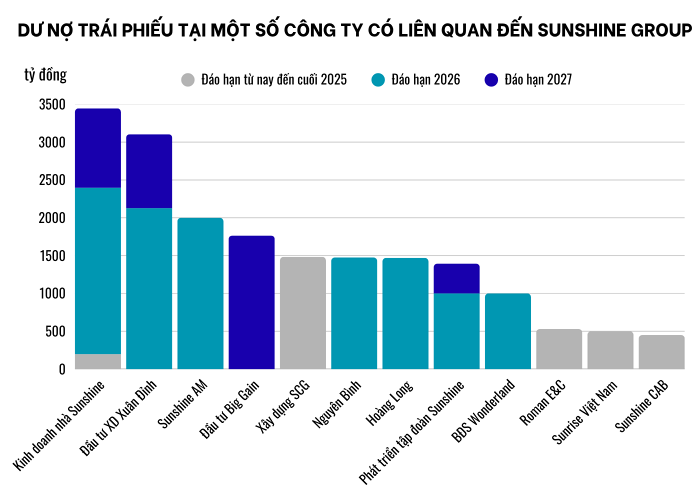 Theo thống kê của người viết, trong số 18.700 tỷ dư nợ trái phiếu của 12 công ty nhóm Sunshine kể trên, khoảng 14.000 tỷ đồng sẽ đáo hạn trong các tháng cuối năm 2025 và năm 2026.